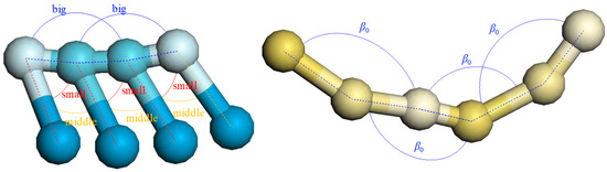where the constant of cosine square bond angle potential Kangle = 25 kJ/mol/rad−2, and the equilibrium bond angle β0 is measured in the coarse-grained model shown in Figure 5. The specific values of β0 are listed in Table 3.