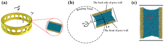 The simulations of the lubricant supply are performed using LAMMPS packages [26]. The lubricant supply model is placed into a simulation box of 100 × 100 × 100 nm3 (x × y × z), and non-periodic boundary conditions are applied to the box boundaries. During relaxation, the lubricant temperature remains stable at 298.15 K, controlled by a Langevin thermostat. Assisted by the NVE ensemble, the lubricant particles undergo Brownian dynamics for 1 ns, ultimately reaching a state of equilibrium. The model that has attained an equilibrium state is considered to represent the pore structure located at the radius r within the porous polyimide retainer, as shown in Figure 6a. The models rotate at a rotation speed ω, with the axial orientation of the pores within the PI consistently perpendicular to the axis of rotation, as depicted in Figure 6b. Consequently, the PAO molecules within the pore experience an axial centrifugal force, leading to a centrifugal effect within the pore, as illustrated in Figure 6c. During simulations, the lubricant temperature remains at 298.15 K using the Nosé–Hoover thermostat. The motion equations are solved using the velocity-Verlet algorithm, employing a time-step of 2 fs.