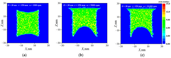 where mi is the mass of the particle, corresponding to a PAO particle with a mass of 9.31 × 10−26 kg; r is the rotation radius; and ω is the rotation speed. Exemplified by the model at a rotation radius of 150 mm undergoing rotation at a speed of 10,000 rpm, the centrifugal force experienced by the PAO particles within the pore is calculated to be 1.53 × 10−11 nN, which is too small to be susceptible to intermolecular forces, thereby precluding an accurate simulation of the lubricant supply behavior. Owing to the scale constraints, it is challenging for molecular models to directly consider the centrifugal effects in macroscopic models. Nevertheless, in molecular dynamics simulations, the influence of force on atoms is ultimately reflected in their velocities, which are determined by solving Newton’s equations of motion. Consequently, this paper adopts an equivalent approach that enables centrifugal effects to be considered in the molecular models. Specifically, under the premise of ensuring that the linear velocity of the simulation matches that of the actual operating conditions, the rotation speed is increased by reducing the rotation radius. Given that the pore size of the model ranges from 10 nm to 30 nm, the rotation radii are uniformly set at 30 nm to ensure consistency in the centrifugal linear velocity of the lubricant for different pore sizes under the same operating conditions. Although this equivalent approach may exaggerate the centrifugal effect to some extent, making lubricant supply easier in simulations than in actual working conditions, it provides a minimum threshold condition for achieving lubricant supply and can help assess the centrifugal effect on the molecular models.
