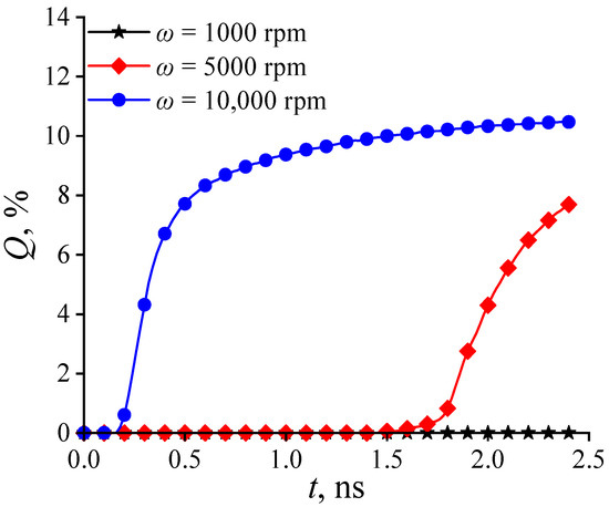 where Q is the lubricant supply rate, and n* is the total number of lubricant particles. Consequently, the lubricant supply rate at different rotation speeds is obtained, as shown in Figure 8. For the low rotation speed (ω ≤ 1000 rpm), the lubricant supply rate remains at zero, indicating that the centrifugal effect generated by the low rotation speed fails to cause the lubricant within the pore to flow out. As the rotation speed increases to 5000 rpm, the lubricant supply rate rises from the instant of 1.44 ns. And when the rotation speed further increases to 10,000 rpm, the supply rate starts to rise even earlier, from 0.16 ns, indicating that the lubricant supply from the pore is faster and greater as the rotation speed increases.