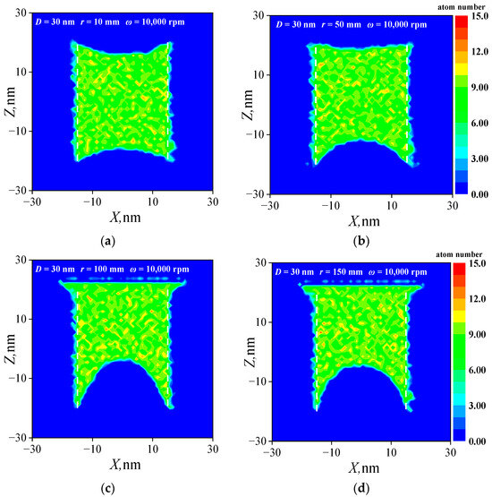 This section investigated the lubricant supply at various rotation radii. A lubricant supply model with a pore diameter of 30 nm was employed, and the rotation speed was set as 10,000 rpm. The rotation radius was set as 10, 50, 100, and 150 mm, respectively. The change in rotation radii is mainly aimed at studying the lubricant supply effect of porous, oil-impregnated retainers with different sizes. Table 5 shows the centrifugal force acting on the PAO molecules at different rotation radii. The centrifugal force exerted on the lubricant intensifies with the increase in rotation radii. Compared to the centrifugal force before the equivalence, the centrifugal force for the same rotation radii increased by five to seven orders of magnitude after the equivalence approach was applied. The density distributions of the lubricants at different rotation radii are shown in Figure 9. Under the conditions of uniform pore size and rotation speed, for the low rotation radius (r ≤ 10 mm), the lubricant surface on both sides of the pore presents a concave shape, with the curvature of the concavity at each end being virtually identical. This indicates that the centrifugal force generated by rotation at a small rotation radius is unable to cause the lubricant within the pore to migrate. As the rotation radius increases to 50 mm, the curvature of the lubricant surface near the axis of rotation increases, while the curvature of the lubricant surface farther from the axis of rotation decreases, indicating that the lubricant within the pore migrates to the far end of pore, driven by the centrifugal force. Upon the increase in the rotation radius above 100 mm, the varying curvature of the lubricant surface becomes even more pronounced, with the lubricant overflowing the pore wall.