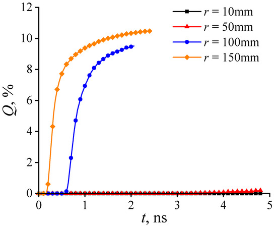 The lubricant supply rate at different rotation radii is obtained using Equation (6), as shown in Figure 10. For the low rotation radius (r = 10 mm), the lubricant supply rate remains at zero, indicating that the centrifugal effect generated by the small rotation radius fails to cause the lubricant within the pore to flow out. As the rotation radius increases to 50 mm, the lubricant supply rate rises from 3.26 ns. As the rotation radii further increase to 100 mm and 150 mm, the lubricant supply rates begin to rise from 0.55 and 0.18 ns, respectively, exhibiting a more pronounced augmentation over time. This indicates that the lubricant supply from the pore becomes more rapid and sufficient as the rotation radius increases.