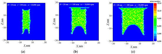 This section investigated the lubricant supply at various pore sizes. The pore size distribution of porous polyimide generally resides at the nanometer level. Therefore, lubricant supply models with diameters ranging from 10 nm to 30 nm were developed, sharing a uniform rotation radius of 100 mm and a constant rotation speed of 10,000 rpm. The centrifugal force acting on the PAO molecules at different pore sizes is uniformly 3.47 × 10−5 nN. The lubricant density distributions at different pore sizes are shown in Figure 11. Under the conditions of uniform rotation radius and rotation speed, for the low pore size (D = 10 nm), the lubricant surface on both sides of the pore presents a concave shape, with the curvature near the axis being greater than that far away. This indicates that while the lubricant migrates, it does not outflow. As the pore size increases to 20 nm, the curvature of the lubricant surface near the axis of rotation increases, while the curvature of the lubricant surface farther from the axis of rotation decreases, indicating that the lubricant within the pore migrates to the far end of the pore. Upon an increase in pore size to 30 nm, the intensification of lubricant migration occurs, resulting in the coverage of the Fe plate surface with lubricant.