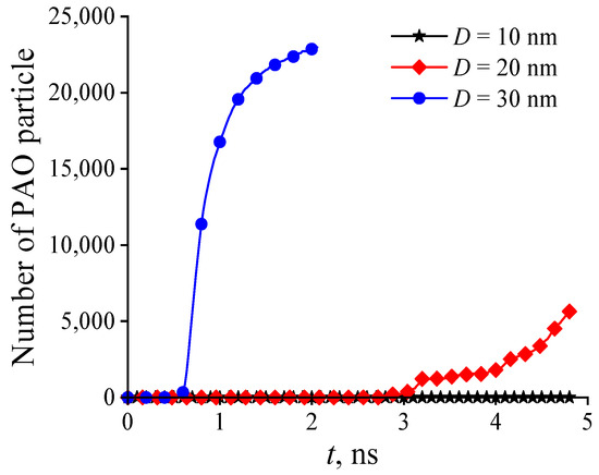 The quantity of PAO particles exiting the pore at different pore sizes is counted, as shown in Figure 12. At the small pore (D = 10 mm), the quantity of PAO particles exiting the pore remains at zero. As the pore size increases to 20 nm and 30 nm, PAO particles begin to appear outside the pore from 2.56 ns and 0.58 ns, respectively, indicating that the lubricant supply from the pore is faster and greater as the pore size increases.