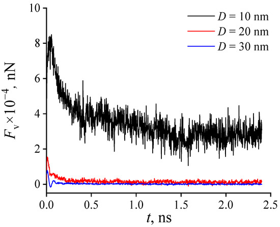 To clarify the mechanism of lubricant supply, the forces acting on the lubricant during stable rotation are analyzed. The concave shape of the lubricant within the pore indicates that the lubricant is influenced by the capillary effect. Consequently, the axial component of capillary force Fv subjected by the lubricant particles in a static model with different pore sizes is statistically analyzed based on the results of the molecular simulation, as shown in Figure 14. It can be observed that the force acting upon the lubricant particles tends to stabilize during the simulation period, with the capillary force being greater for smaller pore sizes. Table 6 presents the average values of simulated axial capillary force for various pore sizes.