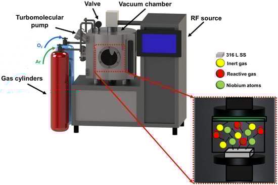 Schematic representation of the experimental apparatus employed to produce Nb2O5 coatings on the surfaces of 316L SS by using the reactive sputtering technique.
