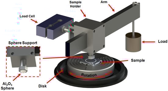The wear analysis was conducted using a pin-on-disk tribometer in accordance with ASTM G99-23 standard [33]. All the wear tests were conducted in triplicate maintaining a constant load (5 N), a track diameter of 9 mm, for a period of 300 s, a sliding velocity of 0.01 m s−1 and using an alumina sphere (Al2O3) with a diameter (Ø) 4.78 mm. It is important to emphasise that all wear tests were conducted at a controlled temperature of 25 ± 1 °C. The samples were fixed on the disk plate by using an appropriated double-side tape that avoided position changing and unevenness of the samples during the wear tests. Both coated and uncoated samples were tested under three environmental conditions: air, after immersion in 0.9 wt% NaCl solution, and in AS with a neutral pH, free from odor or color. Following the wear tests, both coated and uncoated samples for the three environments were verified using a field emission scanning electron microscope (FEG-SEM) JEOL 7001F, equipped with an Oxford light element detector for energy dispersive X-ray spectroscopy (EDX). The use of both techniques was essential for characterizing the wear track profile on the sample surfaces, enabling the investigation of the wear mechanisms associated with the different conditions. In a collaborative effort, an LEXT model OSL4100 3D confocal laser scanning microscope (CLSM) was employed to examine the topography of the wear track and to obtain information regarding the worn area. To this end, a wear profile assessment was conducted at various points along the track, allowing the determination of the average wear area values. In addition, the wear topography was carried out by using a VEECO non-contact high-resolution profiler Wyko NT 1100. The objective lens used was 20× with field of view lens of 0.5×. The measuring technique used was vertical scanning interferometry. The vertical resolution was <1 Å Ra and the lateral spatial sampling was 0.08 to 13.1 mm. The scanning areas for all measurements were kept constant at 470 μm × 620 μm. Four measurements were obtained at each 90° around the worn tracks, and average and standard deviation were calculated. Figure 2 presents a schematic illustration of the pin-on-disk apparatus employed in the wear tests, along with its components: the sphere support, load cell, sample holder, arm, applied load, and the disk.