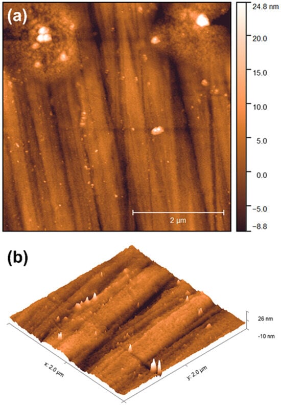 Both 2D and 3D topographic images of the 316L SS can be seen in Figure 3a and Figure 3b, respectively. In both images, the presence of scratches resulting from the sample grinding process can be observed. The topography of the 316L SS alloy containing Nb2O5 coating was evaluated using atomic force microscopy (AFM) over an area of 2.0 × 2.0 µm, as illustrated in Figure 4a. The three-dimensional (3D) morphological projection of the 316L SS/Nb2O5 is shown in Figure 4b, while the measurements conducted to determine the thickness of the coating are presented in Figure 4c. It is evident that the Nb2O5 thin film was deposited uniformly on the substrate surface, exhibiting the presence of certain grains typically associated with the initial stage of nucleation in the vapour phase. The coating produced in the present work using the reactive sputtering technique exhibits a thickness of approximately 130 nm, and is expected to substantially contribute to enhancing the wear resistance of the 316L SS, as will be discussed in the following sections.