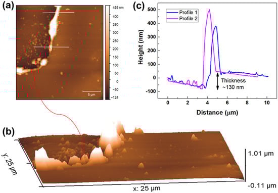 The fitting of the Nb 3D levels revealed a single phase of Nb2O5, which is supported by the predominant contribution at 530.7 eV attributed to O 1s. The DRX results, both measured and Rietveld refined, confirmed the presence of 89 ± 1 wt% Nb2O5, 9 ± 1 wt% NbO2, and 2.1 ± 1 wt% NbO crystalline phases. The oxide compositions were identified using the crystallographic data files PDF 01-089-6902 for NbO, PDF 01-076-1095 for NbO2, and PDF 01-080-2493 for Nb2O5 [26,27,29,30,31]. By employing these comprehensive datasets, it was possible to identify and confirm the presence of the various niobium oxides, which play a crucial role in determining the material properties and functionalities in applications such as coatings. These results are consistent with another study we recently published, where the X-ray absorption near-edge structure spectroscopy (GE-XANES) technique indicated the formation of a uniform layer of Nb2O5 thin films on the Ti-6Al-4V alloy surface [32]. Moreover, when combined with a detector such as pnCCD, this approach enables the monitoring of oxidation processes, which, in fact, allows for the identification of the Nb2O5 coatings. By integrating grazing exit X-ray fluorescence spectroscopy (GE-XRF) geometry with a pnCCD detector, we offer a scanning-free, nondestructive analysis that is depth-resolved within a sub-micrometer range. The pnCCD detector is distinguished by its capacity to discriminate between various energy levels, thereby enabling the selective analysis of specific emission lines and enhancing the accuracy and precision of our data interpretation [32]. Finally, the Nb2O5 thickness of the deposited coating on the 316L SS surface was determined using the atomic force microscopy (AFM) technique.