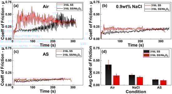 Coefficient of friction of 316L SS and 316L SS/Nb2O5 for different conditions: (a) air, (b) 0.9 wt% NaCl solution after 2 h of immersion, (c) AS after 2 h of immersion, and (d) comparison average COF for all the tested materials.