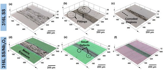 CLSM analysis for the 316L SS and 316L SS/Nb2O5 after the pin-on-disk tests: (a,d) air, (b,e) 0.9 wt% NaCl solution after 2 h of immersion, and (c,f) AS after 2 h of immersion. Magnification of 500×.