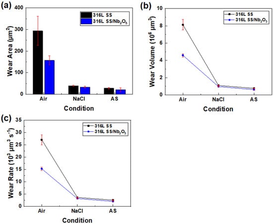 Summary of wear results for 316L SS and 316L SS/Nb2O5 tested under different conditions: (a) wear area, (b) wear volume, and (c) wear rate.