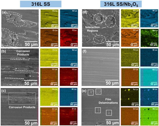 SEM/EDX analysis for the 316L SS and 316L SS/Nb2O5 after the pin-on-disk tests in (a,d) air, (b,e) 0.9 wt% NaCl solution after 2 h of immersion, and (c,f) AS after 2 h of immersion.