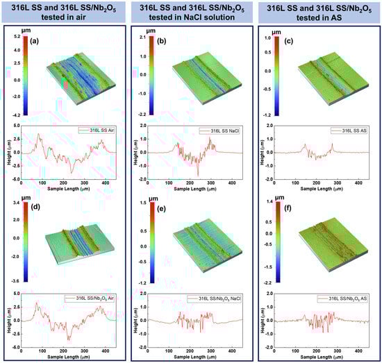 Profilometry analysis and respective wear track profile for the 316L SS and 316L SS/Nb2O5 in (a,d) air, (b,e) after immersion in 0.9 wt% NaCl solution, and (c,f) after immersion in AS.