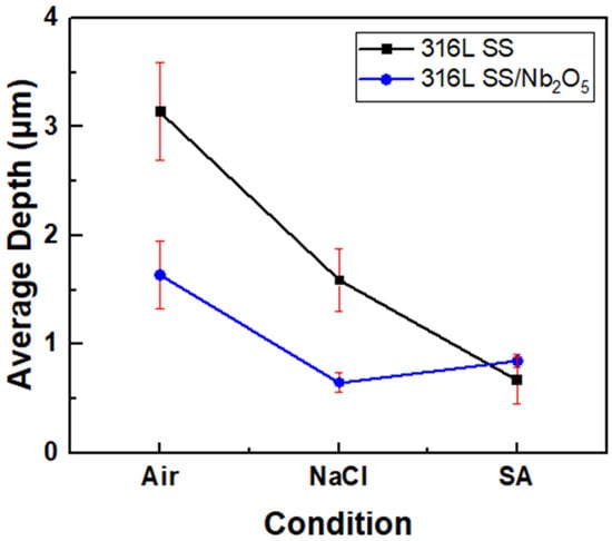 Average depth of the wear track for the 316L SS and 316L SS/Nb2O5 under different environmental conditions.
