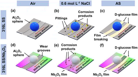 A schematic representation illustrating the influence of environmental conditions on the wear performance of 316L SS and 316L SS/Nb2O5 in (a,d) air, (b,e) after immersion in 0.9 wt% NaCl solution, and (c,f) after immersion in AS.