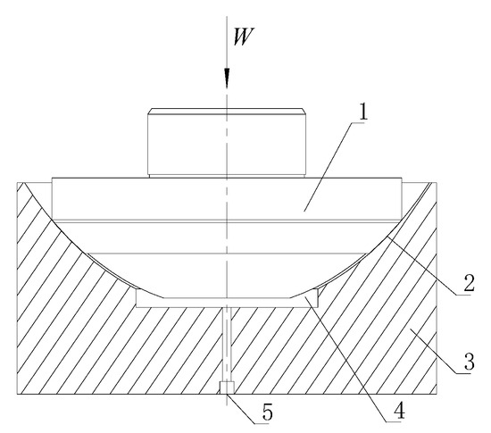 The structure of spherical hydrostatic bearing. 1—bearing body; 2—oil spill gap; 3—bearing housing; 4—high-pressure oil cavity; 5—oil supply hole. Adapted from [35].