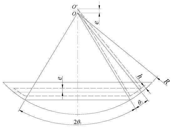 The oil film can be depicted as a narrow gap between surfaces of spherical bearings. A cutting plane, considered along the axis, is defined with the sphere’s radius labeled as R. The high-pressure oil chamber angle is denoted as 2θ1, while the oil seal angle on one side is marked as θ2. The bearing is suspended within the high-pressure hydraulic oil. For the sake of simplicity, the analysis focuses exclusively on the vertical eccentricity of the bearing, neglecting horizontal eccentricity. Figure 2 depicts the vertical distance associated with spherical eccentricity and the subsequent oil seal edge, with the values R = 350 mm, θ1 = 31°, θ2 = 8°.