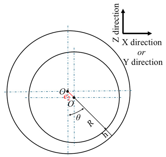 The gap, denoted as h, is determined by the angle, θ, and the spherical radius, R; radial eccentricity, e1 = e, is shown in Figure 2, and axial (vertical) eccentricity, e2, is illustrated in Figure 4.