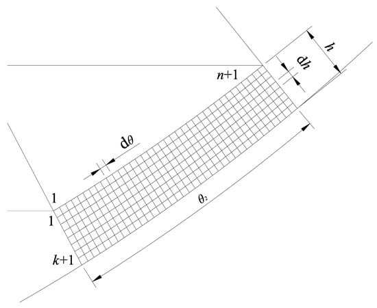 To solve the spherical bearing oil-sealing edge model using numerical calculation methods, the physical model needs to be discretized into a finite number of elements first. The circumferential angle of the oil-sealing edge, ranging from 0 to 2π, is discretized into m elements, with a circumferential step size of dφ = 2π/m, and the node numbers ranging from 1 to m. The axial angle, from θ1 to (θ1 + θ2), is discretized into n elements, with an axial step size of dθ = θ2/n, and the node numbers ranging from 1 to n + 1. Additionally, the thickness of the oil-sealing edge gap, h, is discretized into k elements, with a thickness step size of dh = h/k, and the node numbers ranging from 1 to k + 1, as illustrated in Figure 5.