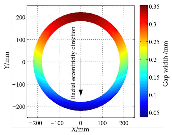 Given a radial eccentricity, e1 = 0.25 mm, and an axial eccentricity, e2 = 0.25 mm, for the bearing body, along with a rotational speed of 100 r/min, we input these values along with other parameters listed in Tables 1 and 2 from reference [35] into the computational program. The solutions yielded the distribution of the oil film gap width and the dynamic pressure after accounting for the bearing body’s eccentricity. The results are illustrated in Figure 6 and Figure 7.