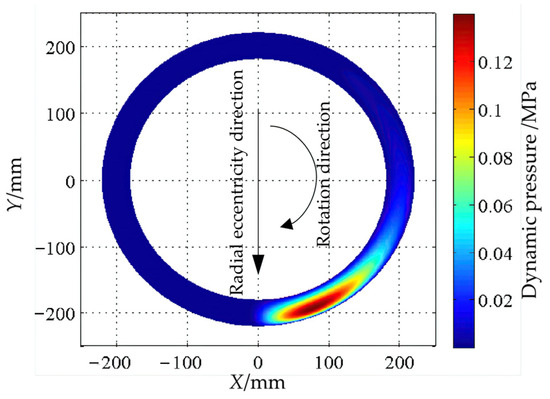 Based on the above computational results, it is evident that after the bearing body experiences eccentricity, the gap width at the oil-sealing edge is significantly reduced in the direction of radial eccentricity. Along the same axial cross-section, the gap width at the oil-sealing edge’s outlet is smaller compared to the inlet. The minimum gap width occurs at the oil-sealing edge’s outlet in the direction of radial eccentricity.