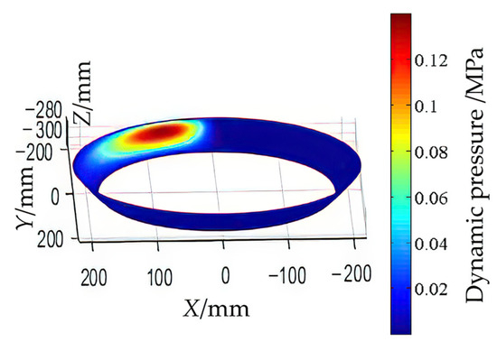 From the pressure distribution diagram, it can be observed that most of the oil film gap within the oil-sealing edge maintains a relatively low pressure. On the side where the gap width decreases along the direction of the bearing body’s rotation, local pressure increases are observed near the region of the minimum gap width. This high-pressure zone, which tends to be near the oil-sealing edge’s outlet, reaches a maximum pressure of approximately 0.14 MPa. The elevated pressure in this area is attributed to the dynamic pressure effect. Analyzing the dynamic pressure distribution for different radial eccentricities reveals that as the radial eccentricity increases, the high-pressure zone becomes progressively smaller, the pressure gradient increases, and the maximum dynamic pressure rises accordingly.