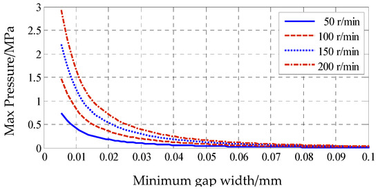With a constant axial eccentricity, e2 = 0.25 mm, we incrementally increase the radial eccentricity, which results in a corresponding reduction in the minimum gap width at the oil-sealing edge. We then investigate how the maximum dynamic pressure varies with the minimum gap width at different rotational speeds. The resulting variation curves are presented in Figure 9.