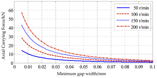 For hydrostatic spherical bearings, the dynamic pressure resulting from the dynamic pressure effect acts on the bearing surface and contributes to an increased load-carrying capacity to some extent. By integrating the computed dynamic pressures, we can determine the axial load-carrying capacity generated by the dynamic pressure effect. The curves illustrating how the axial dynamic load-carrying capacity varies with the minimum gap width at the oil-sealing edge under different rotational speeds are shown in Figure 10.