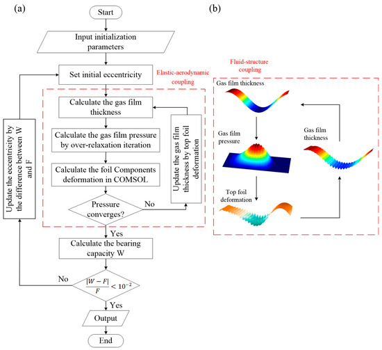 Schematic diagram of the calculation process: (a) the static performance calculations of GFJBs; (b) the coupling of fluid and structure.
