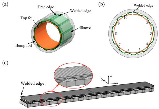 Structure diagram of a bump-type GFJB composed of ten bumps: (a) axonometric view; (b) frontal view; and (c) mesh generation in COMSOL.
