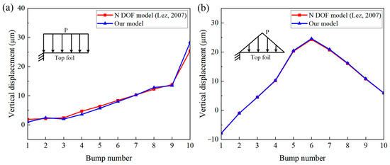 To confirm the validity of the developed model, the results were compared with those reported in a previous study [9], as shown in Figure 5. Two load distributions were considered: (a) uniform and (b) increasing–decreasing; the equivalent pressure in both cases was 0.2 MPa. The friction coefficient was set to 0.1. Bump no. 1 was the fixed end. The ordinate is the vertical displacement of the upper surface of the top foil corresponding to the highest point of the bump foil. Under the two load distributions, the simulation results of our model closely aligned with those in reference [9], thus validating the precision of our model.