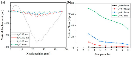 As shown in Figure 6, the vertical displacement of the top foil shows oscillation, and the closer the position is to the middle, the more evident the oscillation. The bump foil provides certain support; therefore, the vertical displacement of the top foil is small at the position where the bump and top foils are in contact, whereas the vertical displacement between the two bumps is relatively large. As the top foil thickness decreased, the top foil stiffness decreased, whereas the bump foil stiffness was not affected.