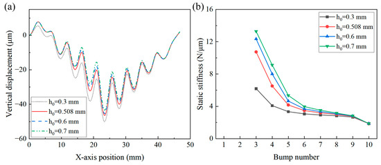 As shown in Figure 8, as the bump height increases, the vertical displacement of the top foil decreases, and the bump foil stiffness increases. That is, as the camber of the bump foil increases, the support provided by the bump foil to the top foil increases.