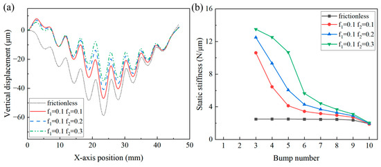 As illustrated in Figure 9 and Figure 10, friction inhibited the vertical displacement of the top foil. As or increases, the inhibitory effect gradually increases. Furthermore, the effect was more evident in the middle position, where the applied load was higher. The presence of friction enhances the ability to hinder deformation, thereby improving the stiffness of the bump foil.