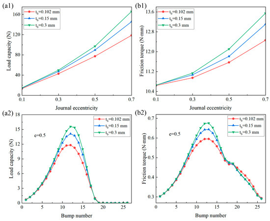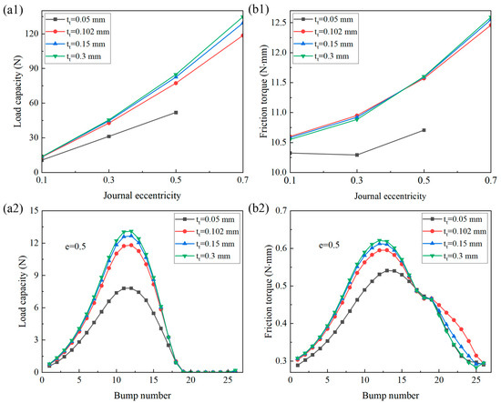 Figure 13 shows the effect of the bump foil thickness on the load capacity and friction torque. Other foil parameters remain unchanged, and the bump foil thicknesses are chosen as 0.102, 0.15, and 0.3 mm. As the bump foil thickness increased, the load capacity and friction torque increased. Furthermore, the effect was more evident at high eccentricities and concentrated in the main bearing zone.