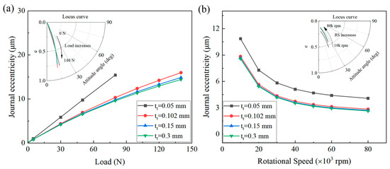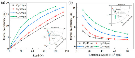 Effects of (a) load and (b) rotational speed on journal eccentricity under various radial clearances.