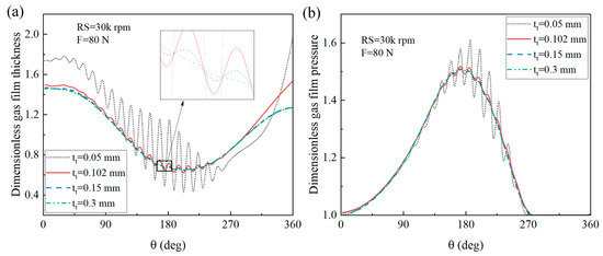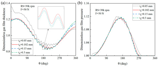Figure 23a,b show the gas film thickness and pressure with various bump heights under a load of 80 N and a rotational speed of 30 k rpm, respectively. As the bump height increased, the fluctuation in the gas film pressure became obvious.