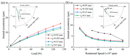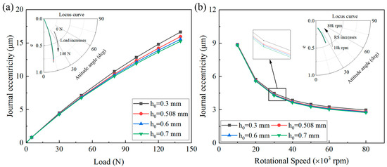 Effects of (a) load and (b) rotational speed on journal eccentricity under various bump heights.