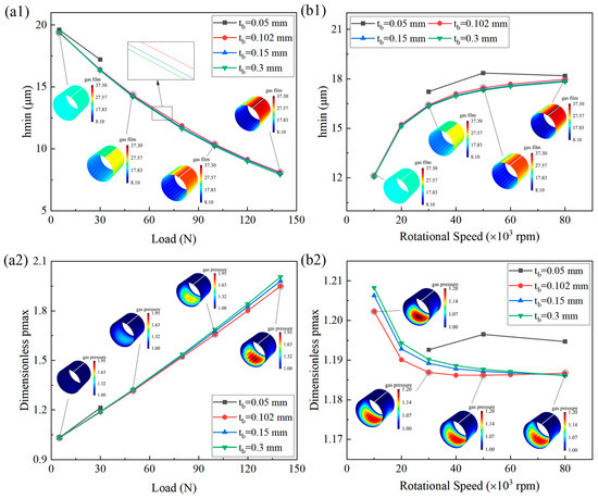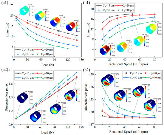 Effects of (a) load and (b) rotational speed on (1) minimum gas film thickness and (2) maximum gas film pressure under various radial clearances.