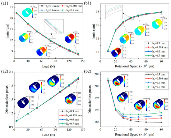 Effects of (a) load and (b) rotational speed on (1) minimum gas film thickness and (2) maximum gas film pressure under various bump heights.