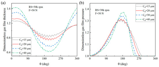 Figure 26a,b show the gas film thickness and pressure with various radial clearances under a load of 50 N and a rotational speed of 30 k rpm, respectively. As shown in Figure 26, as the radial clearance increased, the peak value of the gas film pressure increased, the bearing zone shrank, and the fluctuation decreased.