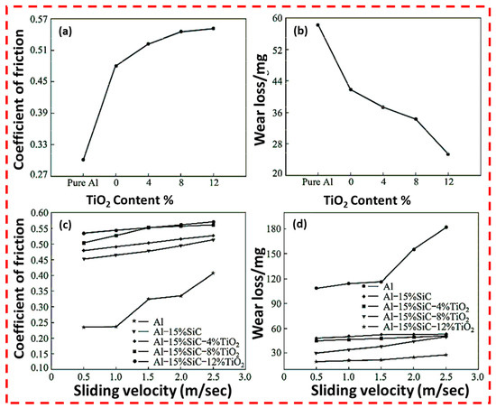 3 also increases the hardness of AMCs, with sample 15 wt.% dual reinforced AMC with Gr/Sn showing the highest hardness due to a higher content of finer particles, which increase dislocation density and restrict movement, enhancing the material’s hardness. The study also introduces coarse particles to avoid an accumulation of fine particles, further optimizing wear resistance. Moreover, the authors incorporate a solid lubricant mixture (1 wt.% Gr + Sn) into the AMCs, substantially improving wear resistance. Tin (Sn) solidifies at the Al grain boundaries, while graphite (Gr), with its hexagonal-layered structure, forms a lubricating film during wear testing, reducing the material wear rate. Additionally, the study notes that the COF of the synthesized AMCs is significantly lower than that of the A390 alloy. The inclusion of solid lubricants further decreases the COF by up to 55% at lower applied loads. This comprehensive research underlines the effectiveness of FeTiO