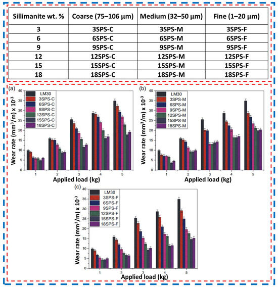 3 reinforcement (4:1; fine: coarse ratio) AMC demonstrated the highest wear resistance, showing a 57% improvement over the LM30 base alloy at a contact pressure of 1.4 MPa.