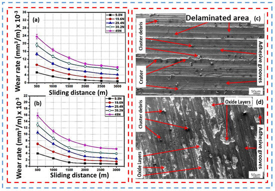 125] study revealed that the wear rate enhanced with applied load due to higher frictional force and plastic deformation between the relative motion of the AMC sample and the disc, resulting in frictional heating and surface softening. Incorporating reinforcement particles, particularly B