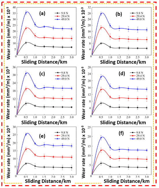 101] conducted wear tests under loads ranging from 1 to 7 kg. They identified high wear rates caused by the interaction and deformation of pin asperities and the steady-state zone, where the formation of oxide layers and MML leads to stabilizing the wear rate. As the load increased, the wear rate rose linearly due to increased friction and plastic deformation on the pin surface, which resulted in debris formation. However, including more rigid FeTiO