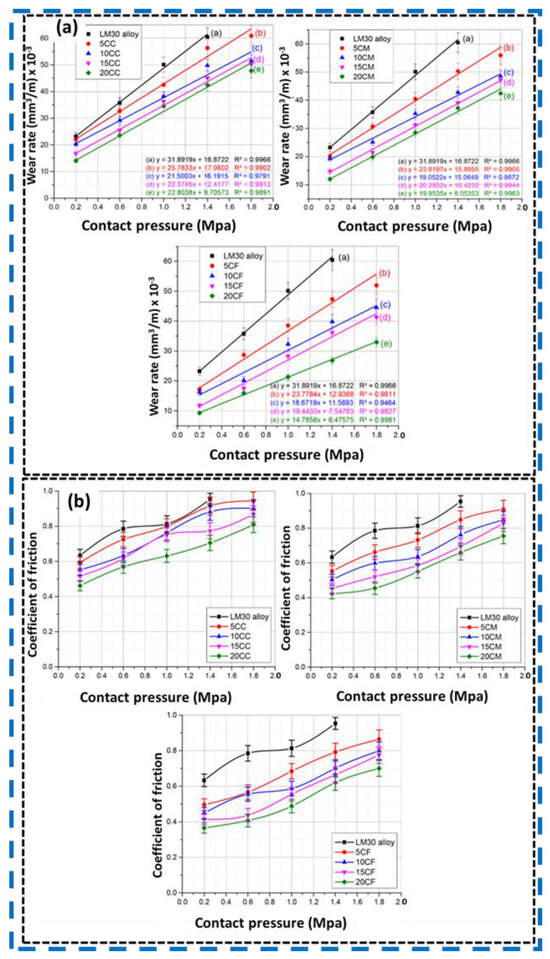 3 concentration and a higher ratio of fine particles. The 20 wt.% reinforced AMC showed a wear rate 64% lower than the base alloy at 1.4 MPa and was 13% lower than a similar AMC with fine particles. The COF increased with contact pressure but decreased with finer particle content, with the 20 wt.% reinforced AMC, achieving a COF 51% lower than the Al alloy. Gupta et al. [