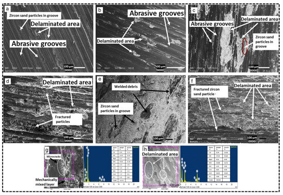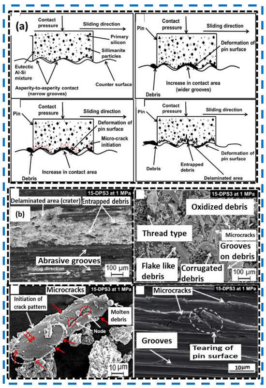 118] conducted at 200 °C, AMCs with fine-sized particle reinforcements demonstrated significantly lower wear rates compared to those with coarse-sized particles under higher loads. A critical shift from mild to severe wear was observed for all AMCs at temperatures above 150 °C. The morphological analysis of the wear track and debris suggested that surface damage was mainly due to crack nucleation around voids at the particle–matrix interface. Below the critical transition temperature (150 °C), the formation of a MML was identified as a vital factor in lowering wear rates. However, above this temperature, the removal of MML, followed by plastic deformation, was found to be the primary cause of increased wear rates.
