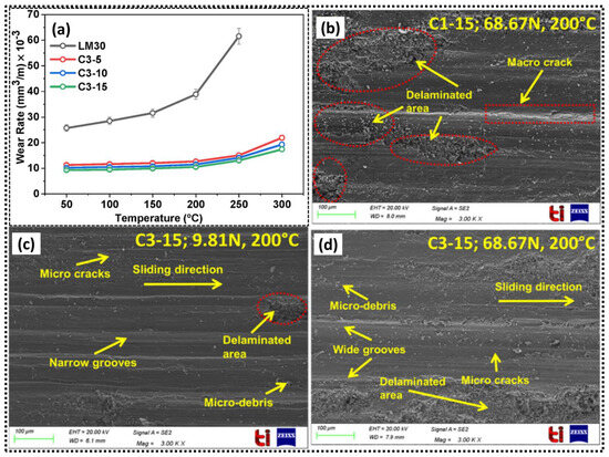 3, the AMCs demonstrated superior wear resistance and retained a finer grain structure at high temperatures, enhancing their performance. However, beyond the critical temperature of 200 °C, a rapid increase in the wear rate was noted for all AMCs due to softening of the contact surface and significant plastic deformation, as represented in
