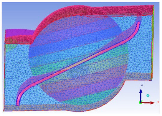 The overall model is divided using unstructured grids. The number of grids is 2,867,328. The number of grids in the overall model is too large. Due to the periodic characteristics of the rolling bearing motion, the calculation time is long for the entire rolling bearing and it is difficult to complete the numerical simulation analysis. “The calculation object is taken as 1/12 of the integral bearing model, including a rolling body”. A groove is established to induce oil into the bearing cavity for lubrication; therefore, a single-period grid model with grooved nozzles is used. In this paper, ICEM CFD (Integrated Computer Engineering and Manufacturing Computational Fluid Dynamics) methods are used to conduct gas-phase numerical simulation analysis of rolling bearings.